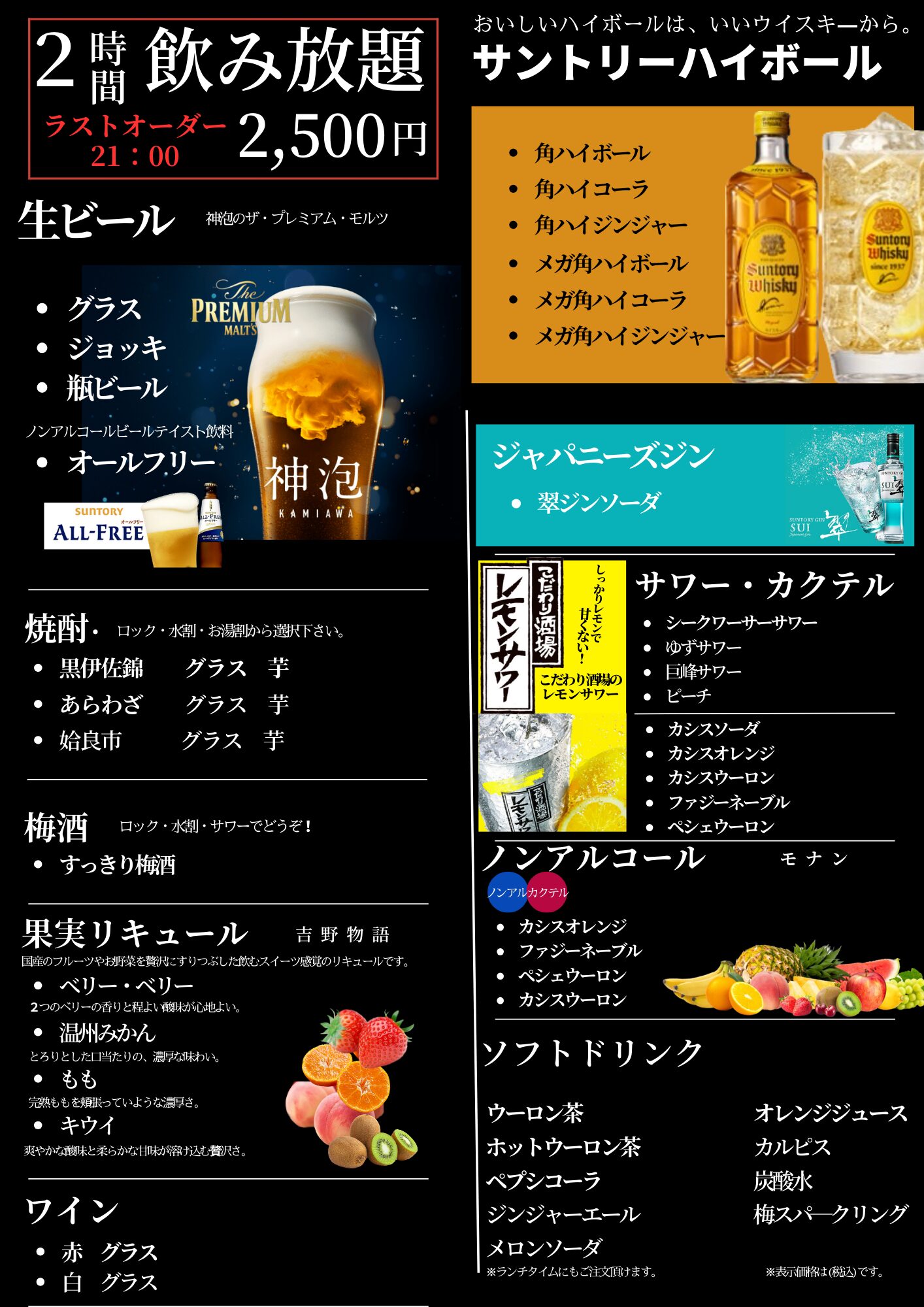 すべてのドリンクが飲み放題になるコース ¥2,500 (税込)